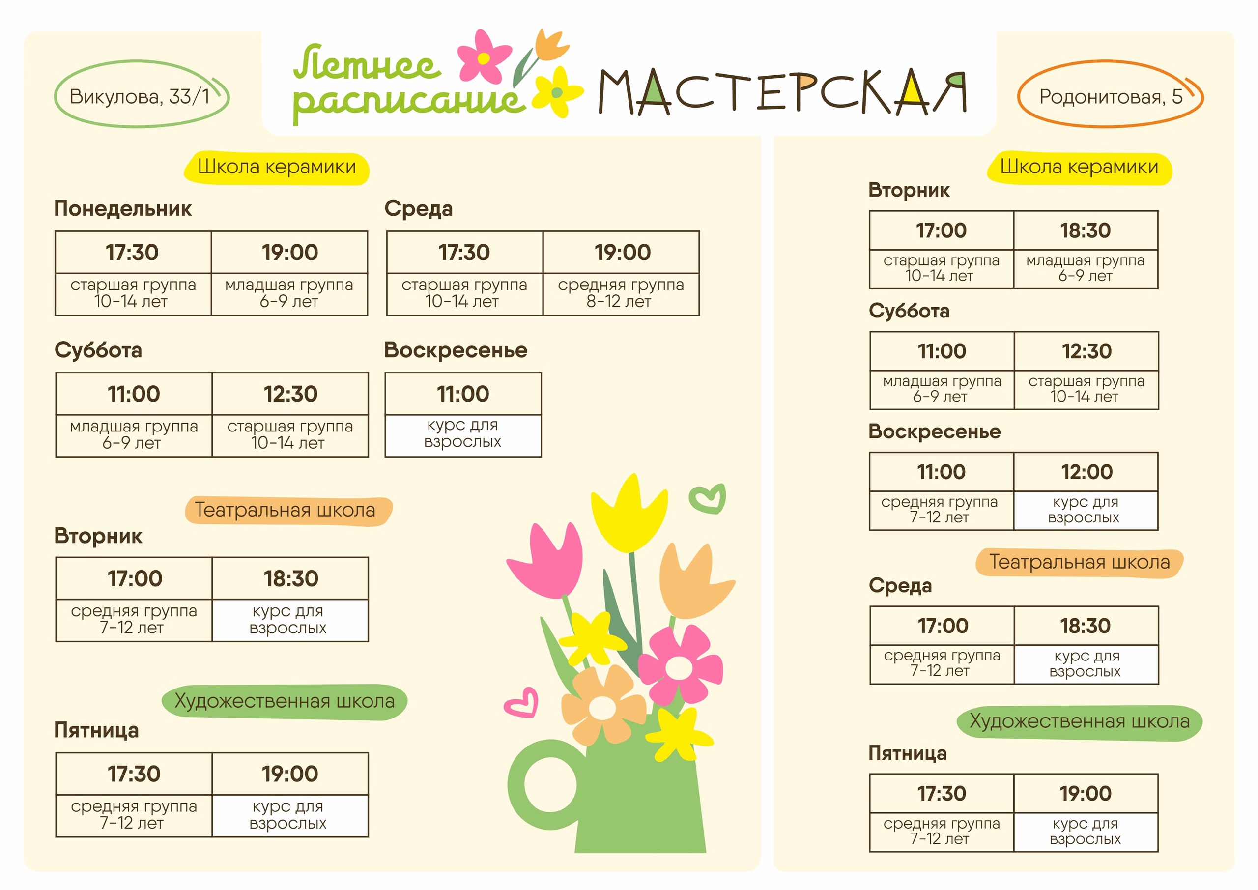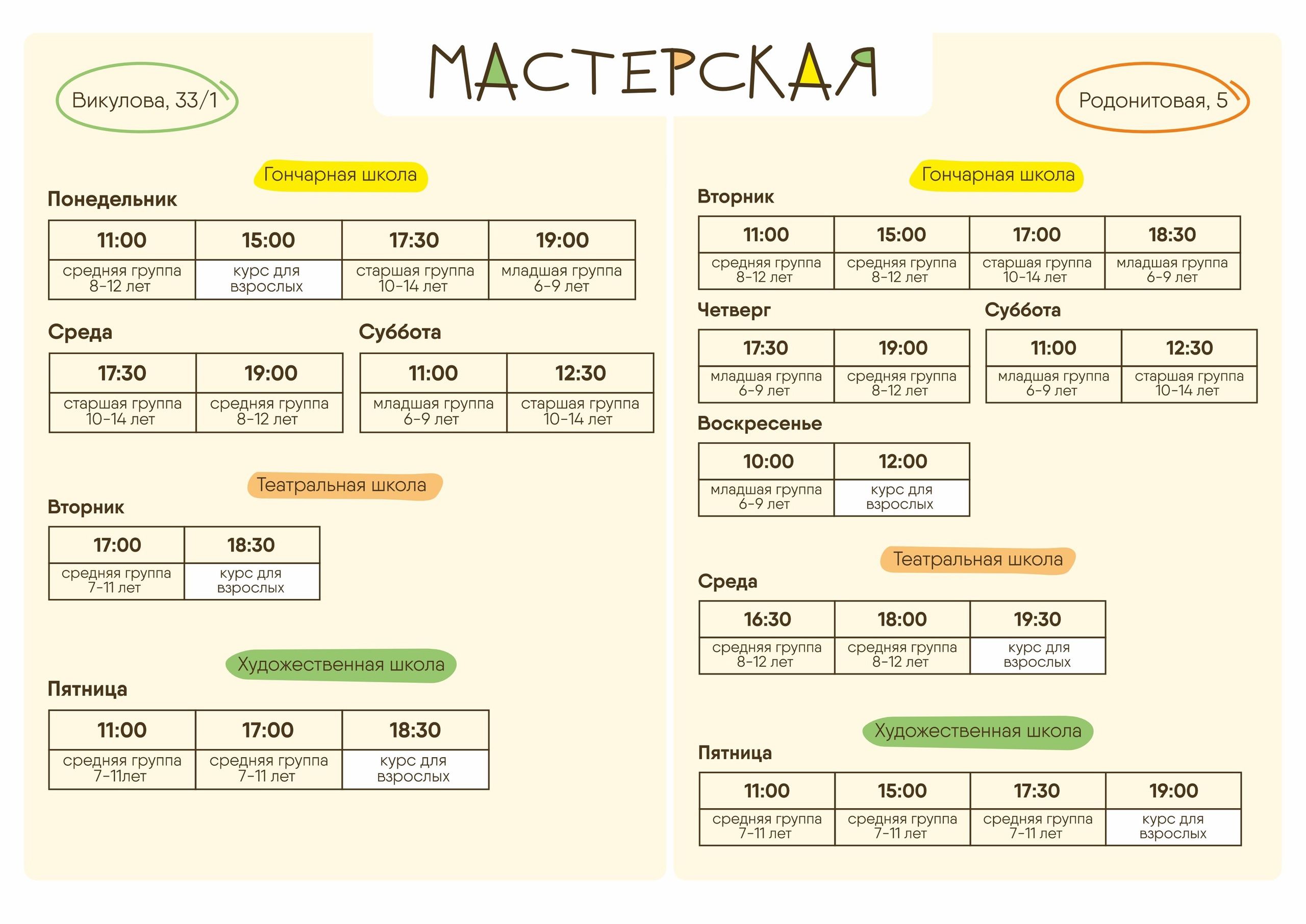 Приглашаем детей в школы: театральную, художественную и гончарную! Здесь ребёнок сможет раскрыть свой творческий потенциал, освоить новые навыки и создать первые шедевры в дружеской атмосфере.